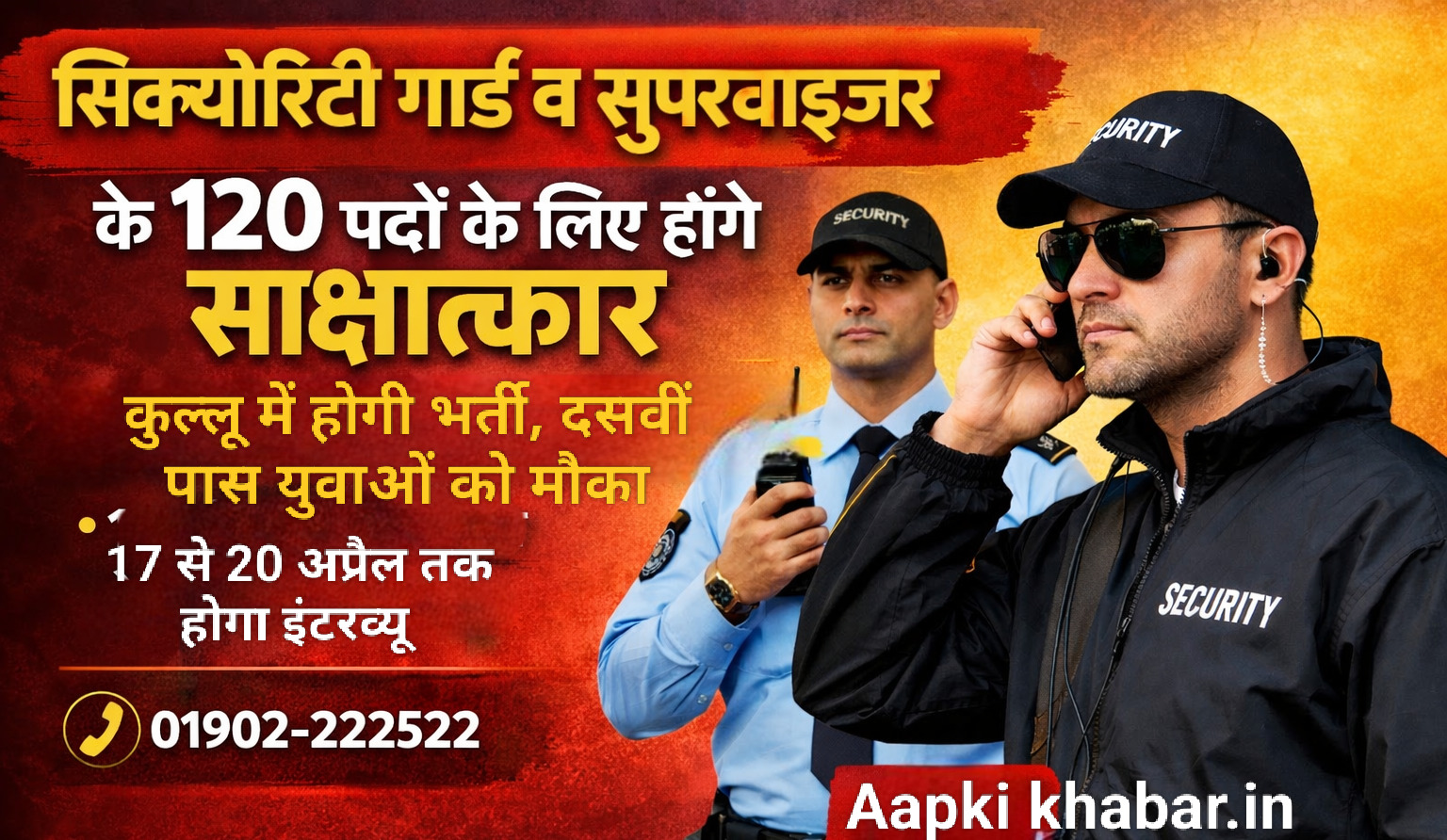 कुल्लू, 16 अप्रैल। एस.आई.एस. इंडिया लिमिटेड आर.टी.ए. हमीरपुर द्वारा सिक्योरिटी गार्ड एवं सुपरवाइजर के 120 पद अधिसूचित किए गए हैं। इन पदों को भरने के लिए साक्षात्कार 17 से 20 अप्रैल से आयोजित किए जाएंगे। यह जानकारी जिला रोजगार अधिकारी कुल्लू ने दी। उन्होंने बताया कि उप रोजगार कार्यालय आनी में 17 अप्रैल, उप रोजगार कार्यालय बन्जार में 18 अप्रैल और जिला रोजगार कार्यालय कुल्लू में 20 अप्रैल को प्रातः 11 बजे साक्षात्कार आयोजित किए जाएंगे।